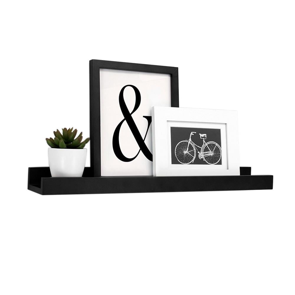 Wide black picture ledge floating shelf, (also called a photo ledge), is designed to easily display and showcase frames or collections of your favorite accessories, books, or functional items.